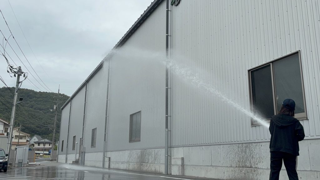 今回の訓練では、実際に消火ホースを使用する体験を行いました。ホースは想像以上に重く、水圧も非常に強いため取り扱いにはコツが必要であることを体感しました。